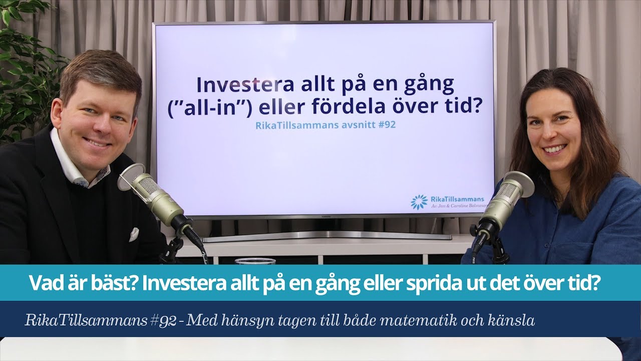 Den här vanliga tittarfrågan är klurig eftersom den har två olika svar – ett matematiskt korrekt och ett känslomässigt. Investera allt på en gång är det rationellt korrekta som ger bäst odds, men om man känslomässigt freakar ut vid en nedgång spelar matematiken ingen roll. Då är det bäst att sprida ut det över tid. Det är också viktigare med vilken portföljsammansättning som man har än hur man tajmar (uppstarten av den).