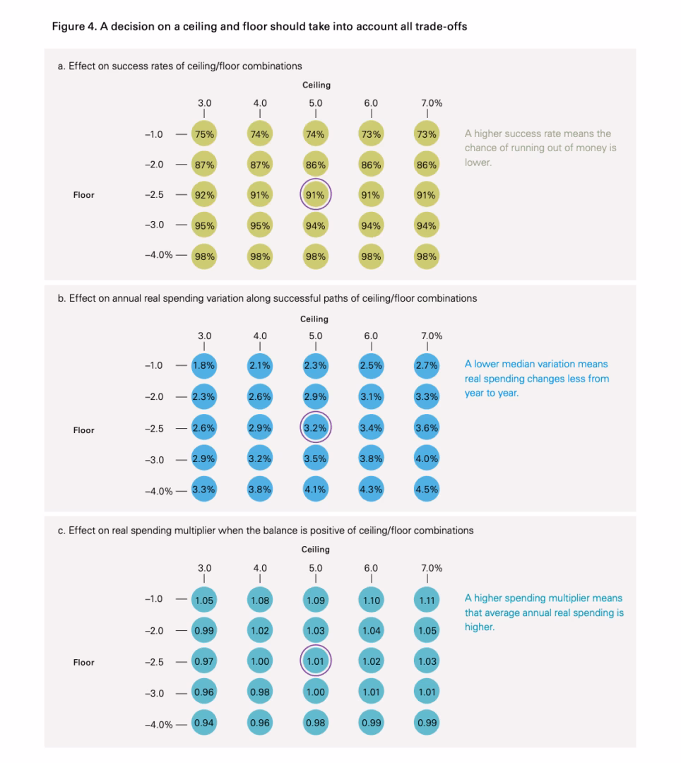 Vanguard har sedan i sin studie undersökt avkastningen för de här olika strategierna, hur ofta de lyckas, slutbelopp som andel av startbeloppet och vilka nivåer man ska välja på golvet och taket.