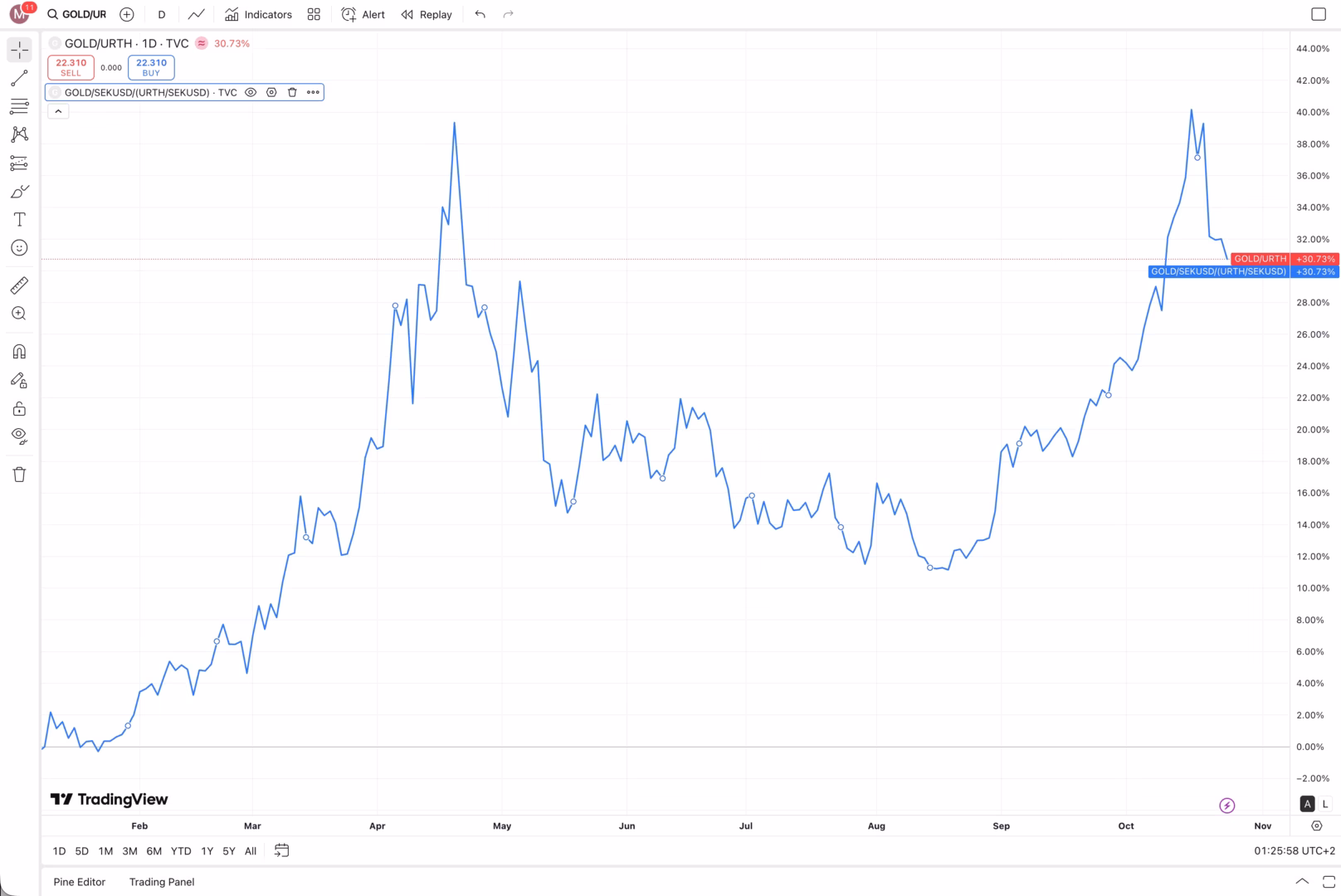 Det betyder att om vi i början av året köpte dollar för 11,06 SEK/USD så hade den till den 22 oktober stärks (=dollarn försvagats) till 9,4209 SEK/USD. Det motsvarar en förändring om ca -15%. Ett exempel: det betyder att om vi köpte 100 USD i januari, då betalade vi 1.106 SEK men om vi sålde dem nu i oktober, då har bara fått tillbaka 942,09 SEK. Det vill säga en förlust på 164 SEK.